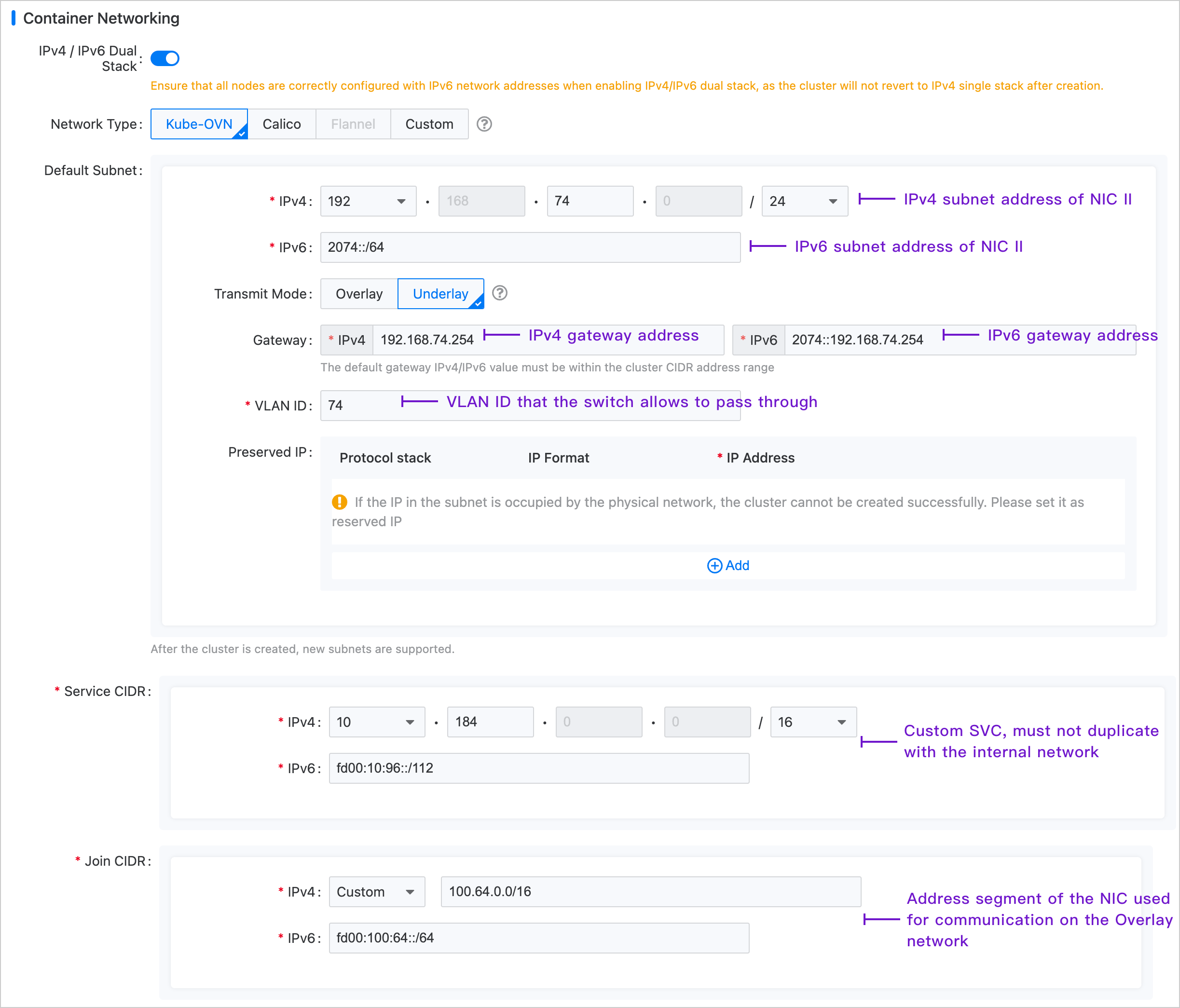 Note: The Join subnet has no practical significance in the Underlay environment and primarily serves to create an Overlay subnet later, providing the IP address range necessary for communication between nodes and container groups.